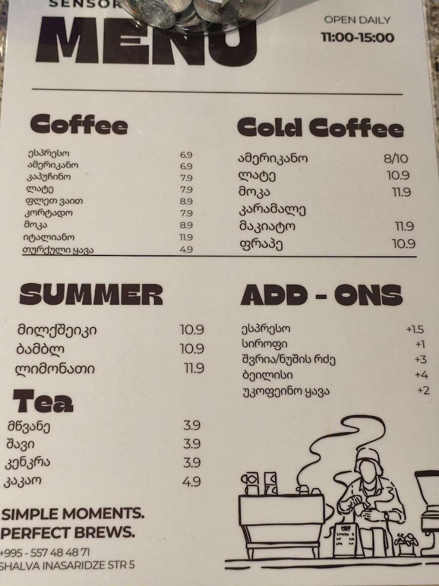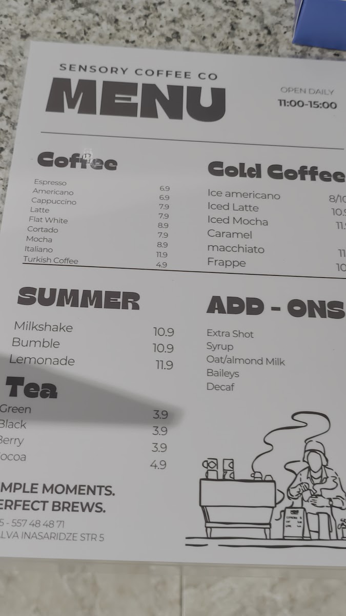 The menu at Sensory Coffee primarily focuses on a selection of coffee and related beverages, designed to cater to coffee enthusiasts and those seeking a quality coffee break. Visitors can expect a variety of coffee drinks prepared with expertly combined coffee beans and milk, suitable for casual visits or quick orders.